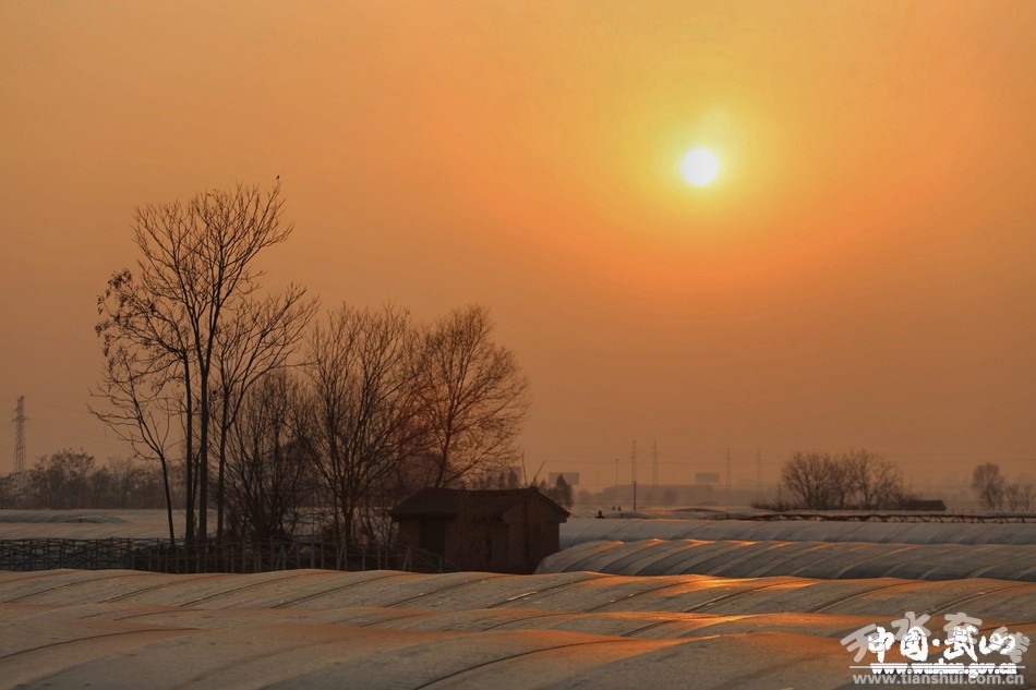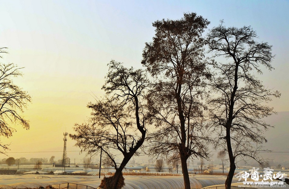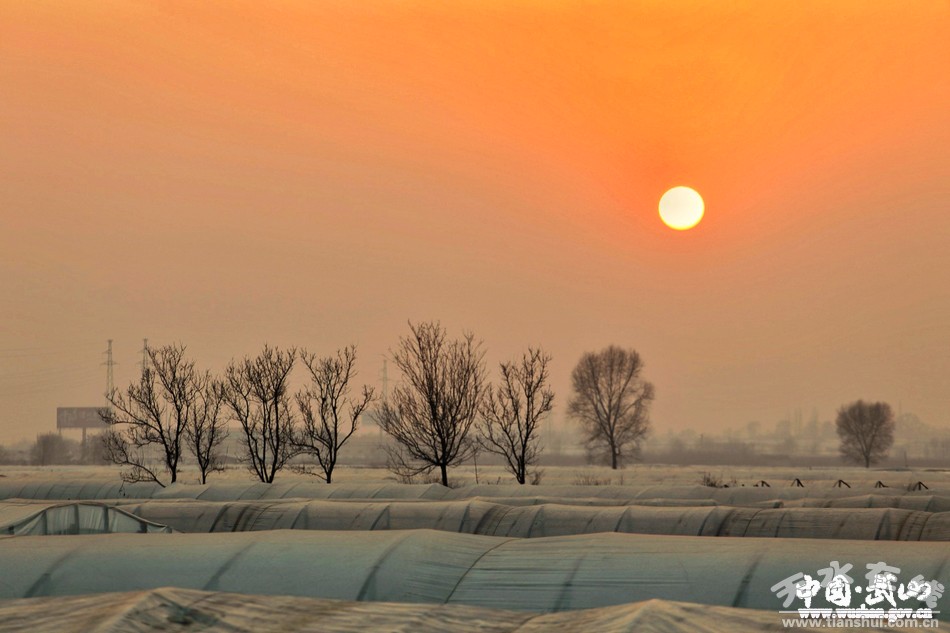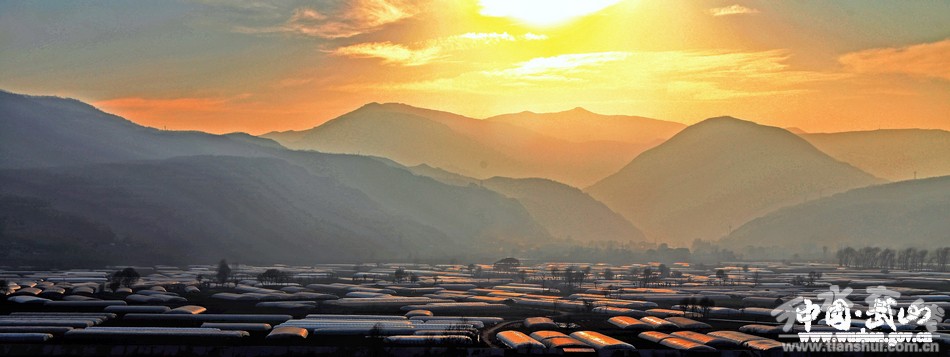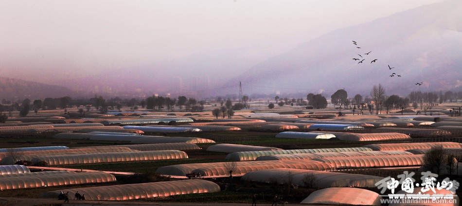 冬日的武山,在廣袤的川道地區(qū),一望無(wú)際的蔬菜塑料大棚錯(cuò)落有致,為無(wú)雪的大地添上一道道美麗的風(fēng)情線。太陽(yáng)落山前,晚霞為冬暖棚涂上一抹抹橘紅的衣裳,如詩(shī)!如畫(huà)。ㄎ/圖 薛耀忠)