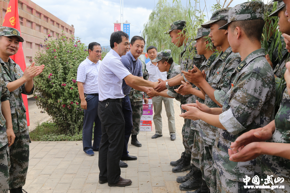 7月5日,縣委常委、政法委書記王志軍,縣政府副縣長李康寧深入武山大道洛門鎮(zhèn)孟莊水毀路段等受災(zāi)現(xiàn)場,看望慰問奮戰(zhàn)在抗洪搶險救災(zāi)一線的解放軍指戰(zhàn)員、武警部隊官兵、公安消防戰(zhàn)士,代表縣委、縣政府以及50萬武山人民向他們致以誠摯的問候和衷心的感謝,并為他們送上了慰問品?h人武部部長黃峰一同看望。