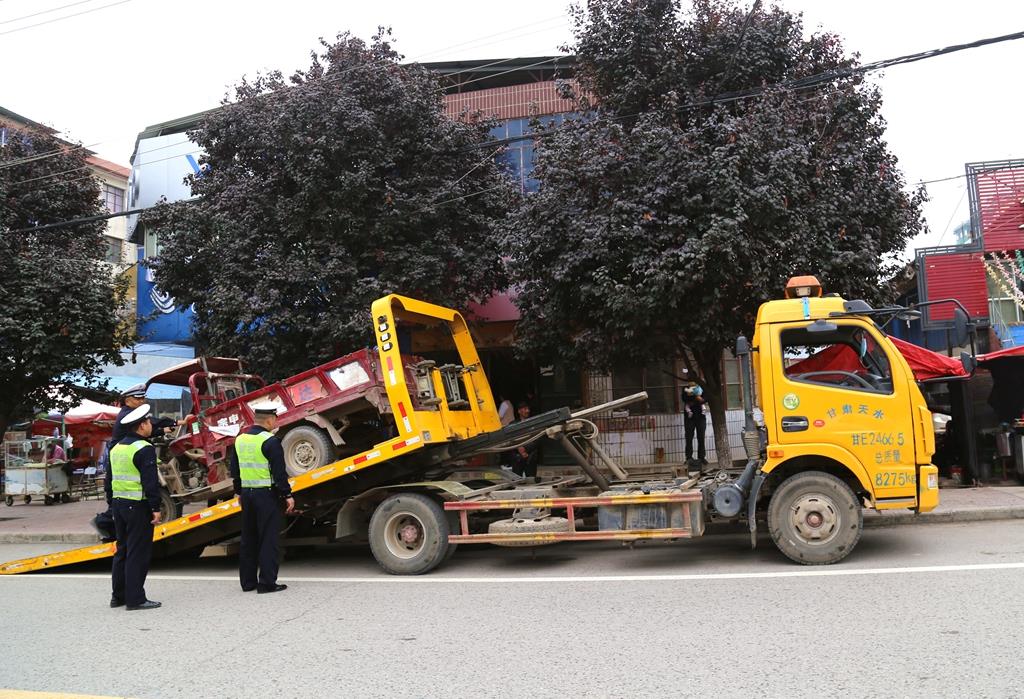 武山縣融媒體中心9月28日訊(記者 王繼明 車彤瑤)9月27日,武山縣副縣長(zhǎng)、縣公安局局長(zhǎng)李森帶領(lǐng)縣公安、綜合執(zhí)法、交警等部門執(zhí)法人員在城區(qū)通遠(yuǎn)街舊貨市場(chǎng)、寧遠(yuǎn)大道解放路、君山路、南濱河路等地開展百日攻堅(jiān)城鄉(xiāng)交通大整治行動(dòng)。重點(diǎn)對(duì)門店外溢、亂堆亂放、亂搭亂建等“八亂”現(xiàn)象進(jìn)行了集中整治,徹底清理各類違規(guī)違章現(xiàn)象,確保市容整潔、交通暢通。