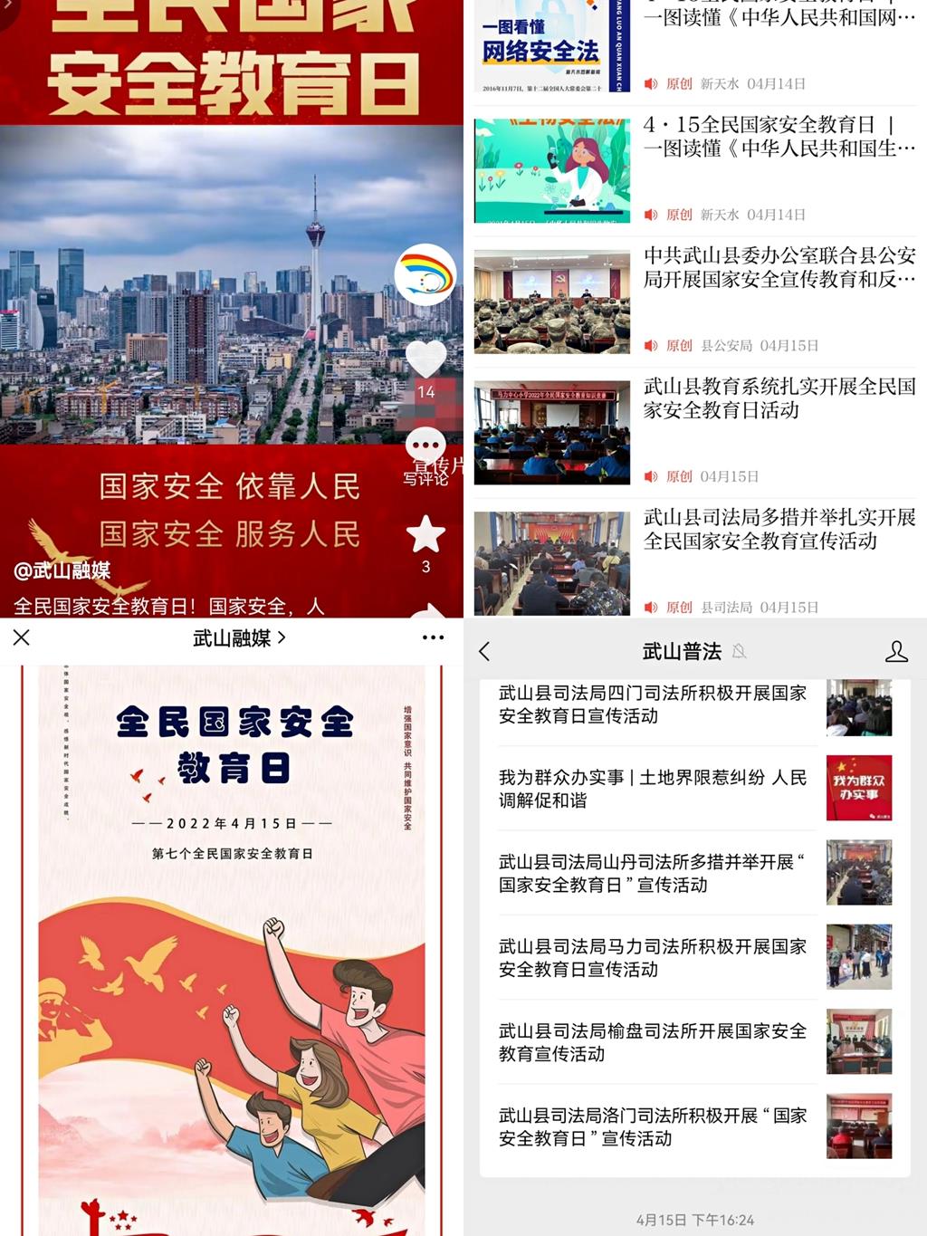 活動(dòng)中,制作國(guó)家安全宣傳短視頻,錄制“普法小課堂”專題講座,舉辦國(guó)家安全知識(shí)競(jìng)賽,利用“武山發(fā)布”“武山融媒”“武山司法”“武山普法”等微信公眾號(hào)、新武山APP和抖音、快手等平臺(tái)推送短視頻20余個(gè),發(fā)布圖文稿件66條,發(fā)放《國(guó)家安全法》等知識(shí)手冊(cè)和宣傳折頁5500余份,張貼海報(bào)50余張,推送國(guó)家安全公益短信4.62萬條,營(yíng)造了“國(guó)家安全,人人有責(zé)”的濃厚氛圍,取得了良好的社會(huì)效果。