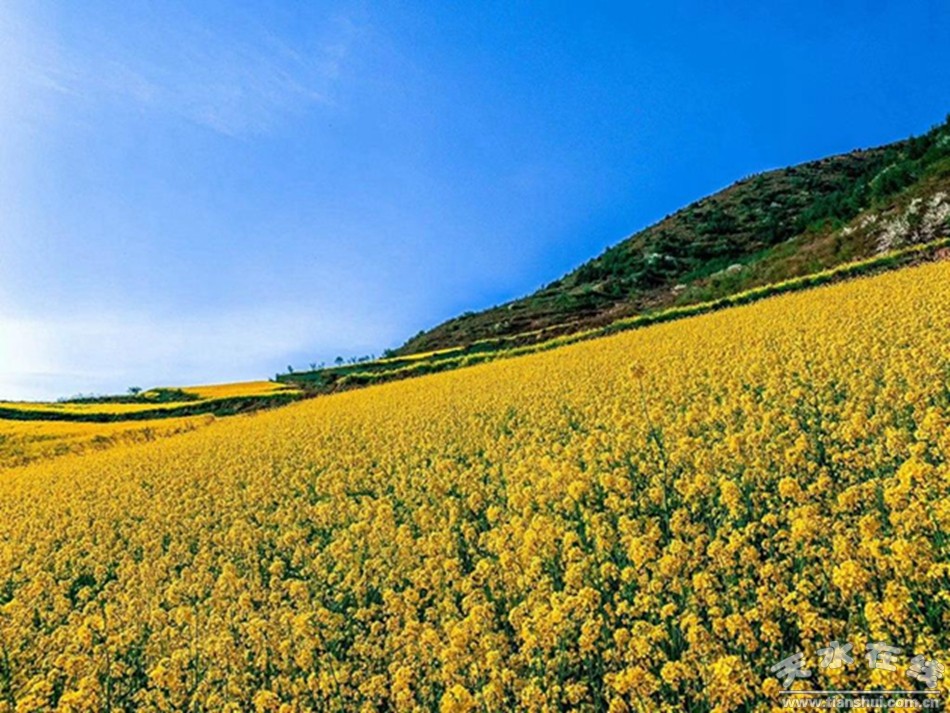 每年四月,龍臺(tái)鎮(zhèn)萬畝油菜花便會(huì)迎著春風(fēng)次第盛開。從空中俯瞰,大地像鋪上了金色的地毯,碧綠的河水從中穿過,梯田式的油菜花與遠(yuǎn)山近水交相輝映,金燦燦的油菜花與綠油油的麥田相映成趣,形成了獨(dú)具風(fēng)格的山水田園風(fēng)光。