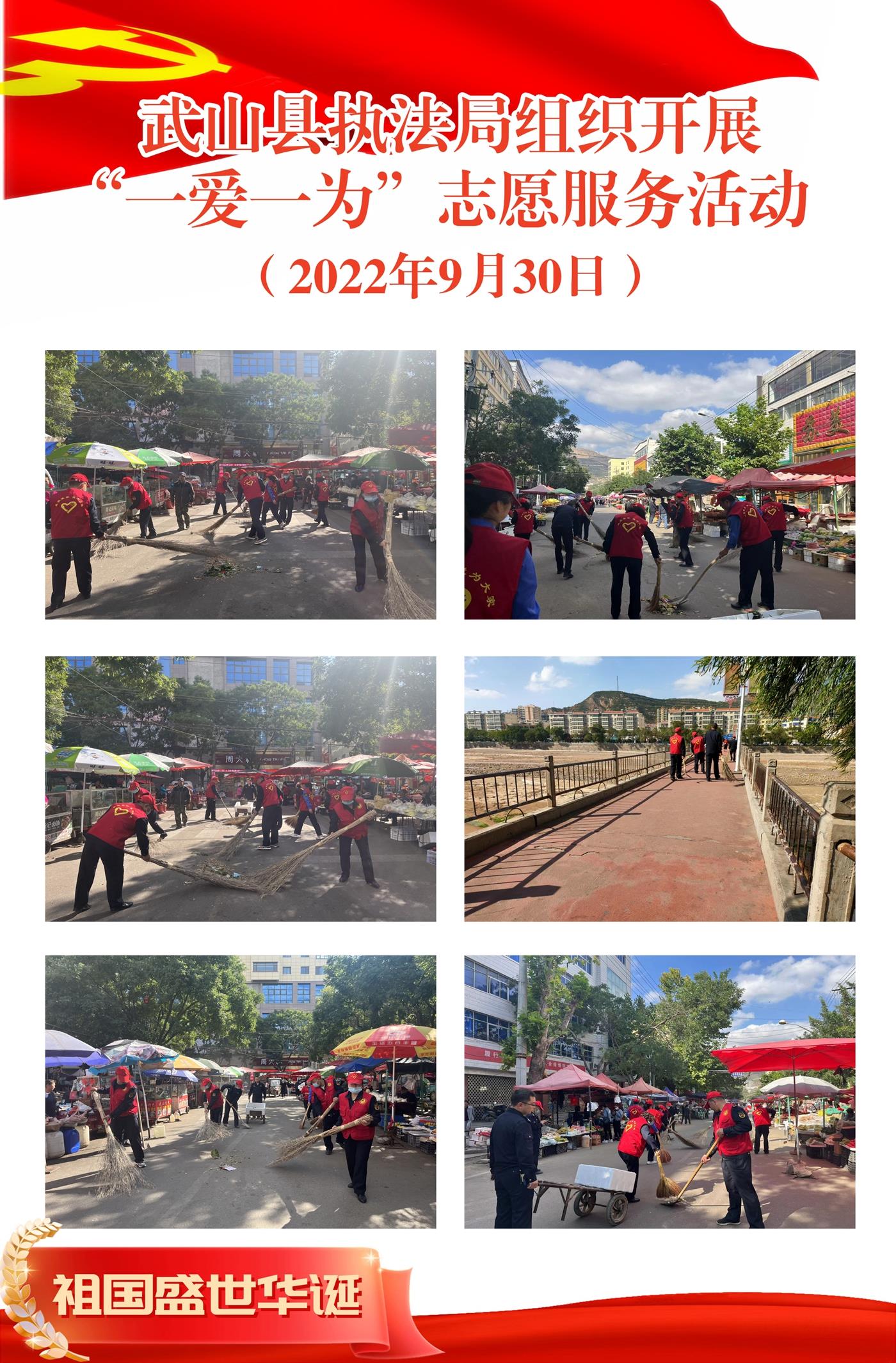 武山縣融媒體中心9月30日訊(記者 唐文斌 蘭紅紅)為慶祝中華人民共和國(guó)成立73周年,弘揚(yáng)中華民族傳統(tǒng)美德,9月30日,武山縣各鄉(xiāng)鎮(zhèn)各部門(mén)各單位統(tǒng)籌新時(shí)代文明實(shí)踐志愿服務(wù)隊(duì)伍,圍繞衛(wèi)生清理、雜物清除、矛盾糾紛調(diào)解等方面,開(kāi)展志愿服務(wù)活動(dòng),把暖心服務(wù)送到群眾面前。