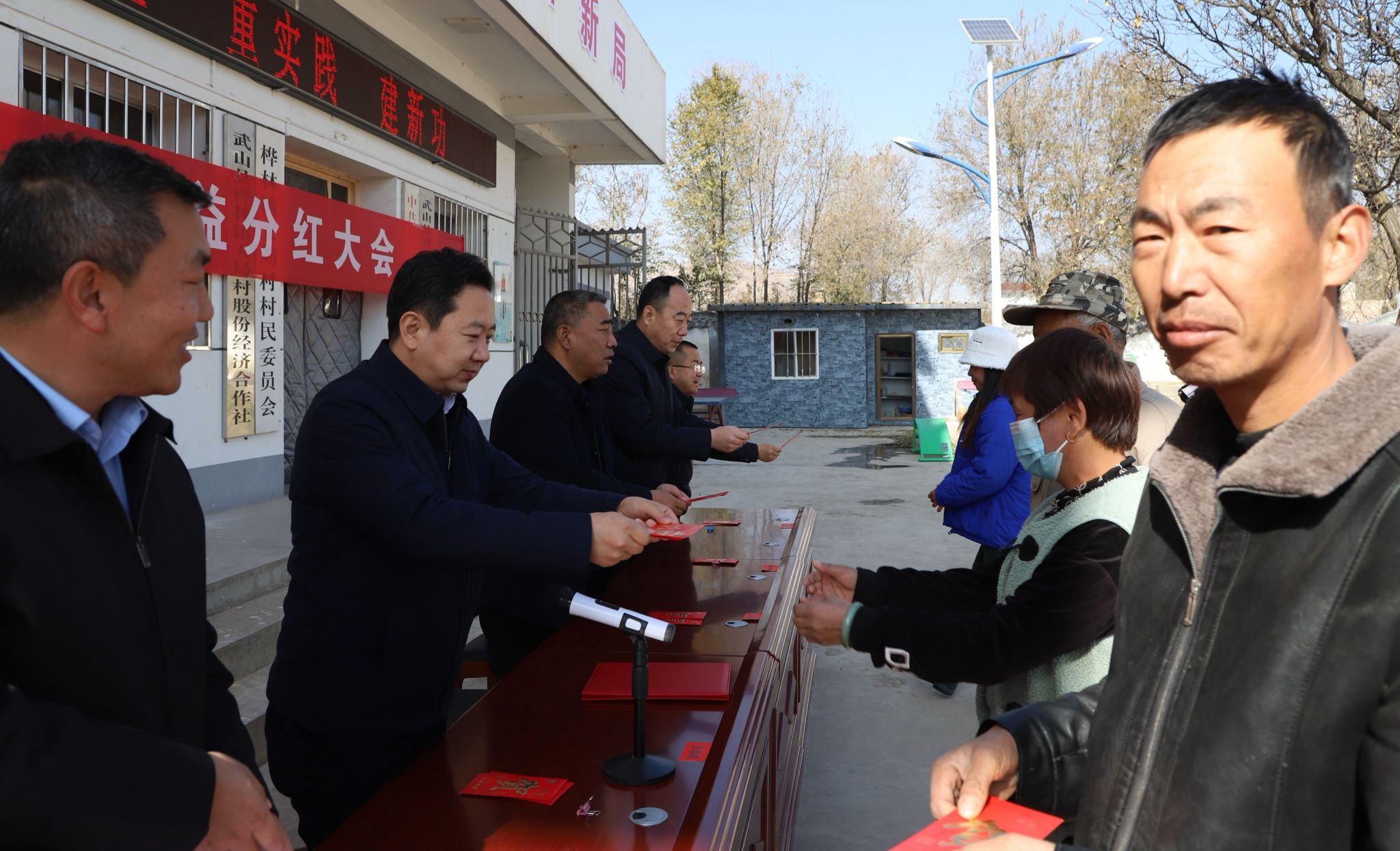 11月22日,武山縣樺林鎮(zhèn)天局村在村級(jí)黨群活動(dòng)中心廣場(chǎng)舉行村集體經(jīng)濟(jì)收益分紅大會(huì),縣委副書記、縣長(zhǎng)王志成講話并宣布分紅開(kāi)始。