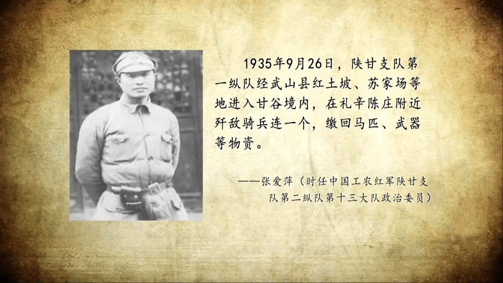 后來,張愛萍將軍在回憶錄中如此記述:1935年9月26日,陜甘支隊第一縱隊經(jīng)武山縣紅土坡、蘇家場等地進入甘谷境內(nèi),在禮辛陳莊附近殲敵騎兵連一個,繳回馬匹、武器等物資。