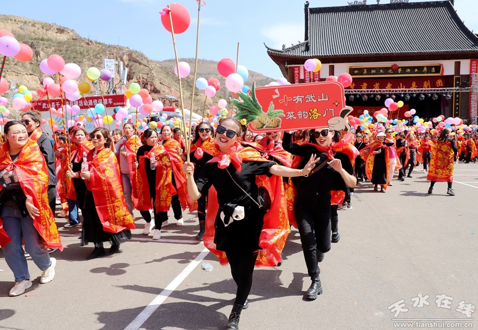 新武山訊(記者 車彤瑤 楊耀斌)3月25日,隴上菜都·十有武山“搗蒜罐 迎百祥 納萬!甭彘T鎮(zhèn)千人蒜罐舞激情上演,洛門鎮(zhèn)5個片區(qū)和3個社區(qū)的1000余人組成了演出隊(duì)伍,在國家4A級旅游景區(qū)水簾洞用搗蒜罐這種民俗活動迎百祥、納萬福,為“天水麻辣燙”吃貨節(jié)添彩。