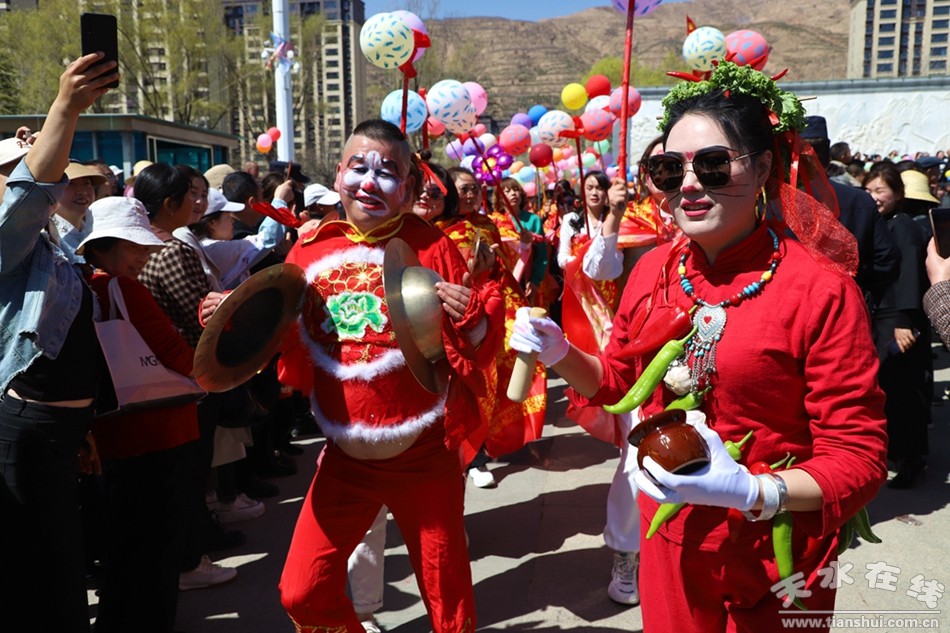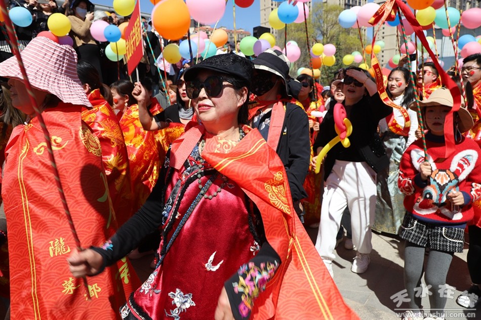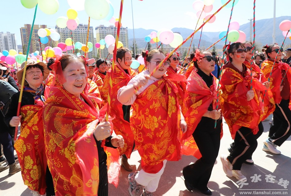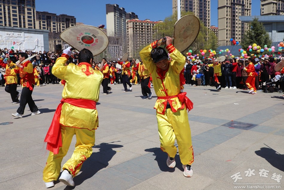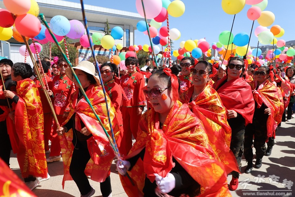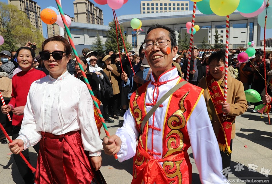 來(lái)自城關(guān)鎮(zhèn)21個(gè)村、6個(gè)社區(qū)的展演隊(duì)為市民和游客帶來(lái)精彩的秧歌、旋鼓、搗蒜罐舞等傳統(tǒng)非遺民俗表演,游客和非遺愛(ài)好者伴著歡快的節(jié)奏,與演員“同臺(tái)”演出。每個(gè)人身披文創(chuàng)產(chǎn)品搗蒜罐披風(fēng)、手持長(zhǎng)竿或非遺道具,扭起歡快的蒜罐舞,跳起特色的秧歌,打起鏗鏘的旋鼓,精彩的表演贏得全場(chǎng)喝彩,觀眾紛紛拿出手機(jī)拍照留念。
