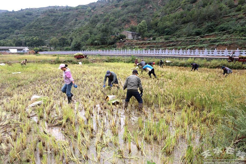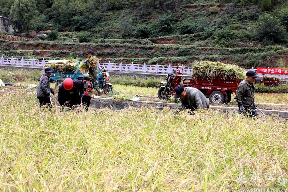新武山訊(記者 康正東 管秋勇 見習(xí)記者 陳歡歡)時值金秋,武山縣溫泉鎮(zhèn)溫泉村的百畝稻田一片金黃。微風(fēng)拂過,稻浪翻滾,清香襲人。村民們正忙著收割、捆扎、搬運,臉上洋溢著豐收的喜悅!皽厝暶住庇瓉砹擞忠粋豐收年。