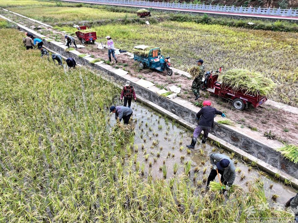 “今年貢米長勢比往年還要好,穗頭大、顆粒飽滿,今天正式開鐮收割!”溫泉村村民牛強(qiáng)武一邊往車上裝著剛采收的水稻,一邊高興地說道。“我們的貢米喝的是溫泉水,吃的是富硒土,品質(zhì)絕對有保證,希望有訂購意向的人前來溫泉村訂購!