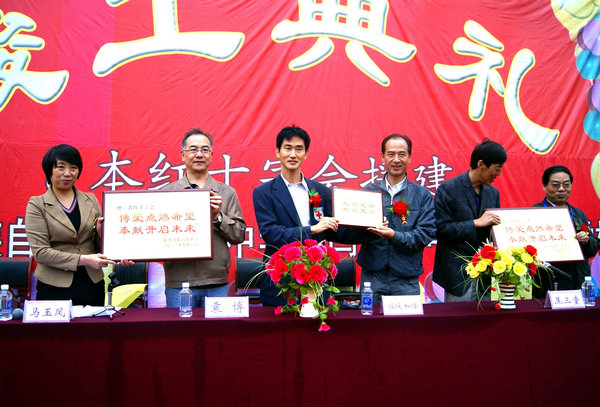 位坂和隆與袁博一同為閆家中學(xué)揭牌