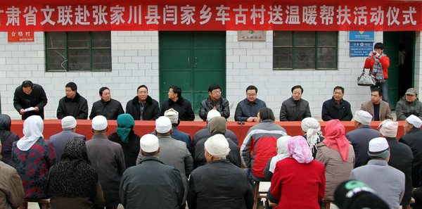 歲寒送暖情更濃,1月6日上午,甘肅省文聯(lián)黨組書(shū)記、副主席、省書(shū)協(xié)主席馬少青帶領(lǐng)省文聯(lián)秘書(shū)長(zhǎng)王登勃、省文聯(lián)工會(huì)主席劉滿才,在天水市文聯(lián)主席王進(jìn)文,市扶貧辦主任談啟明,張家川回族自治縣委書(shū)記劉長(zhǎng)江,縣委副書(shū)記、縣長(zhǎng)馬中奇,縣委副書(shū)記妥國(guó)保,縣委常委、副縣長(zhǎng)馬全榮,縣委常委、宣傳部長(zhǎng)王志軍等領(lǐng)導(dǎo)的陪同下,冒著嚴(yán)寒,翻山越嶺,深入幫扶點(diǎn)——張家川縣閆家鄉(xiāng)車古村開(kāi)展節(jié)前扶貧濟(jì)困送溫暖活動(dòng),把黨和政府的溫暖祝福送到了困難群眾的心坎上。