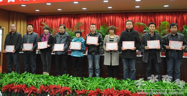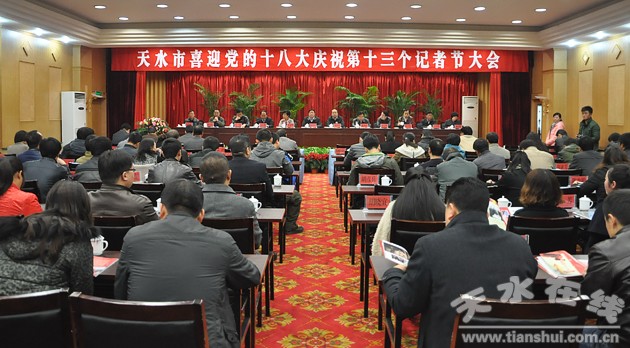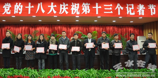 11月7日下午,天水市喜迎十八大慶祝第十三個記者節(jié)大會隆重召開,天水市委常委、宣傳部長彭鴻嘉出席會議并作重要講話,天水市人大副主任謝簡平、天水市副市長霍衛(wèi)平、天水市政協(xié)副主席何道華出席會議。市委宣傳部常務(wù)副部長王小熊主持會議。會上對近年來在全市新聞戰(zhàn)線上做出優(yōu)異成績的10名“十佳新聞工作者”、24名“優(yōu)秀記者(編輯)”、8名“優(yōu)秀主持人”進(jìn)行了表彰獎勵。