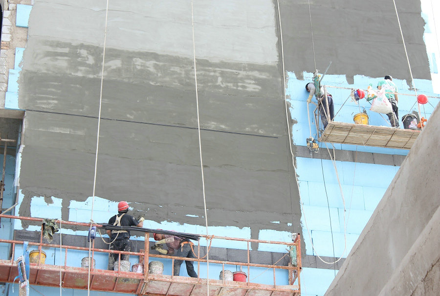 在建筑物外,整個施工現(xiàn)場全部暴露在太陽底下,沒有一點遮陰的地方,10多位施工工人頂著烈日忙活著,他們正在將工地上堆放著的鋼筋、水泥、沙子、消防設(shè)備等材料緊張有序的挪動到最適合“它們”的位置上,而站在升降機上正為外墻粉刷保溫沙漿的工人,一直在賣力地工作,他們的汗水已將衣服濕透,但他們手上的工作依舊在快節(jié)奏地進行。
