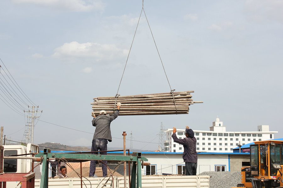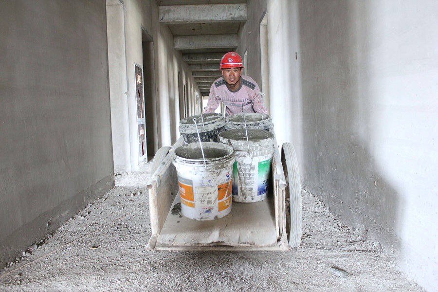 在建筑物內(nèi)部,相比屋外沒有了白花花的烈日火辣辣地照射他們,但是施工人員黝黑的臉上沁滿汗珠,不時有幾個工人停下手頭的工作,拭擦著快要浸入眼睛的汗水,很快又投入到忙碌的施工作業(yè)中。電焊工手下各式部件被他們焊接成型、水泥工手下大量的水泥磚塊被他們組壘在一起、鋼筋工手下一條條鋼筋被他們加工成形……