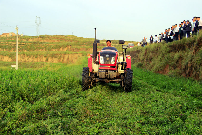 ▲工作組觀摩嘉禾草業(yè)公司收割苜蓿