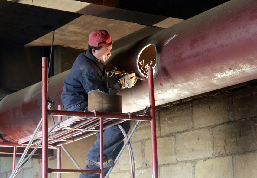 (一名工人在熱源廠焊接供熱管道)