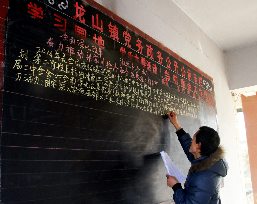 龍山鎮(zhèn)通過辦黑板報的形式,把全委(擴大)會要點寫在了全鎮(zhèn)了解信息最直接的地方,同時鎮(zhèn)黨委提出了要把貫徹縣委十二屆六次全委(擴大)會議精神與深入學習黨的十八屆三中全會精神相結合;要把貫徹會議精神與開展黨的群眾路線教育實踐活動相結合;要把貫徹會議精神與總結全年工作和謀劃來年工作相結合;要把貫徹會議精神與當前重點工作相結合;要把貫徹會議精神與加強黨風廉政建設相結合的“五個結合”要求。