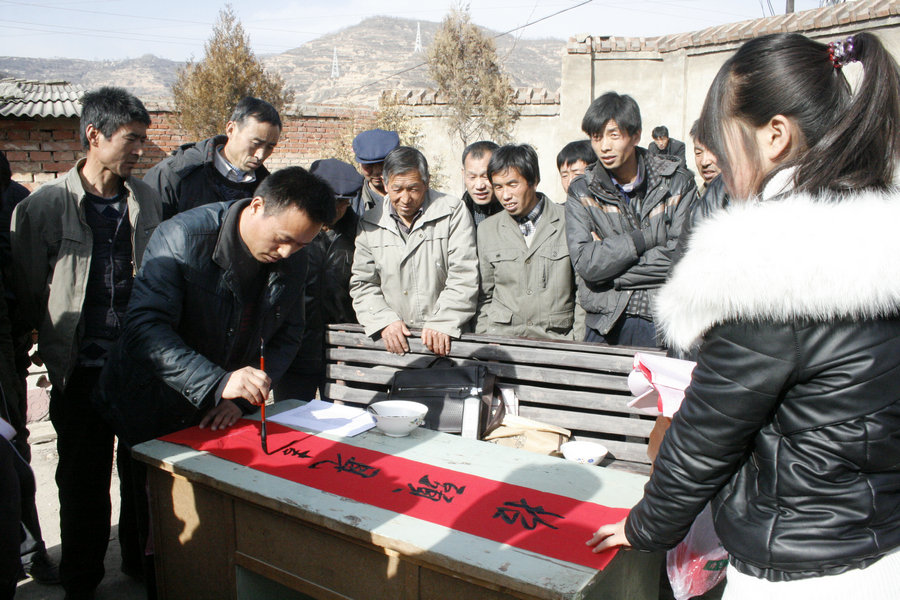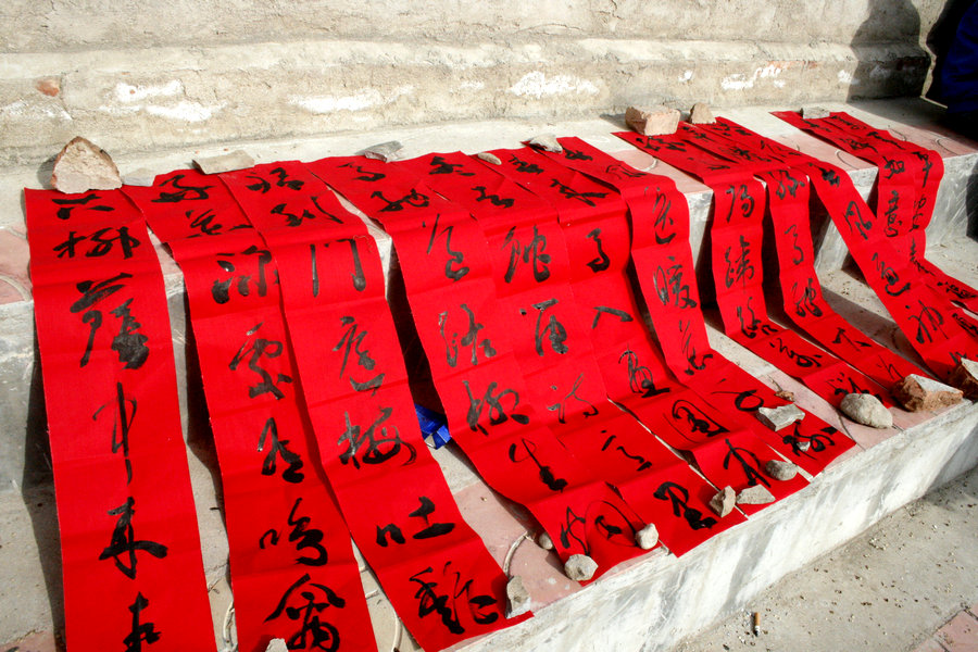 “過(guò)大年,貼春聯(lián)”是中華民族的傳統(tǒng),是象征吉祥、表達(dá)人們向往美好生活的民族風(fēng)俗。在張家川縣2014年迎新春“送戲下鄉(xiāng)”活動(dòng)現(xiàn)場(chǎng),最耀眼的要數(shù)“寫(xiě)春聯(lián)、送春聯(lián)”了,縣書(shū)畫(huà)家身邊圍滿了農(nóng)民群眾,他們有的幫著按紙,有的在排隊(duì)等待著,眼中充滿了期待和喜悅!爸袊(guó)心,中國(guó)印,中國(guó)結(jié),中國(guó)夢(mèng),心心相印結(jié)成夢(mèng)、百年轍,百年辛,百年贏,百年情,轍轍艱辛贏在情”、“美麗中國(guó)夢(mèng),文明幸福家”、“聯(lián)村聯(lián)戶連民心、為民富民真惠民 ”,一幅幅吉祥喜慶、墨寶飄香的春聯(lián)既寫(xiě)出了農(nóng)民群眾對(duì)新年的喜悅,也描繪大家對(duì)更加美好生活的憧憬和期待。來(lái)自我縣的書(shū)法家,現(xiàn)場(chǎng)揮毫潑墨,為百姓書(shū)寫(xiě)了近300幅春聯(lián)。紅紅的紙、紅紅的對(duì)聯(lián),映紅了村民的心,也映紅了紅紅的日子。
