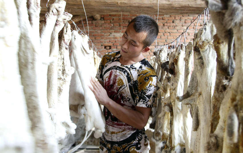 (李剛在一間兔皮晾曬廠房查看獺兔皮的質(zhì)量 )