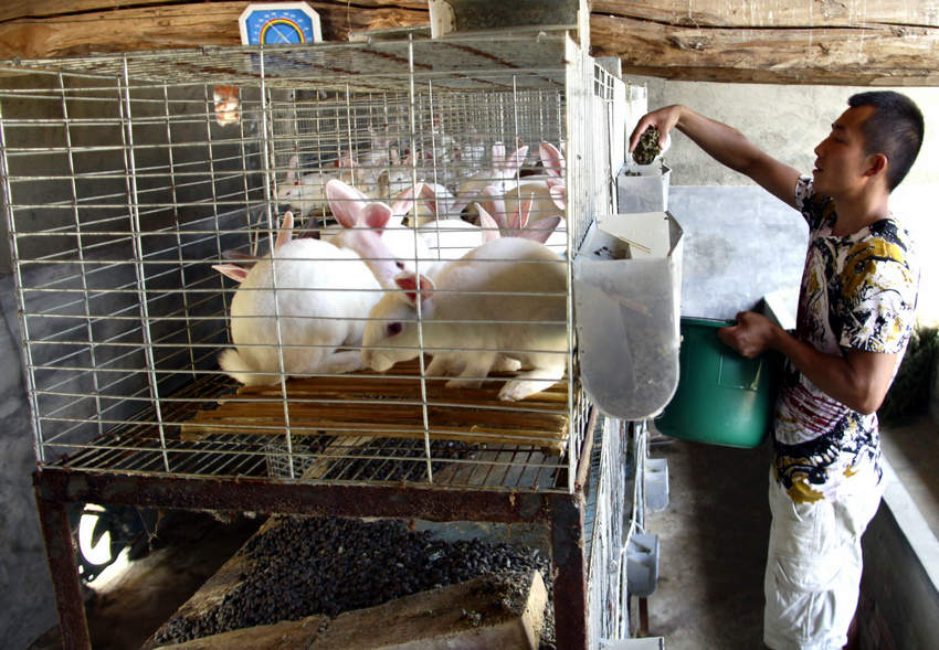 (李剛在一間養(yǎng)殖房內(nèi)給兔子喂自己加工的生態(tài)飼料)