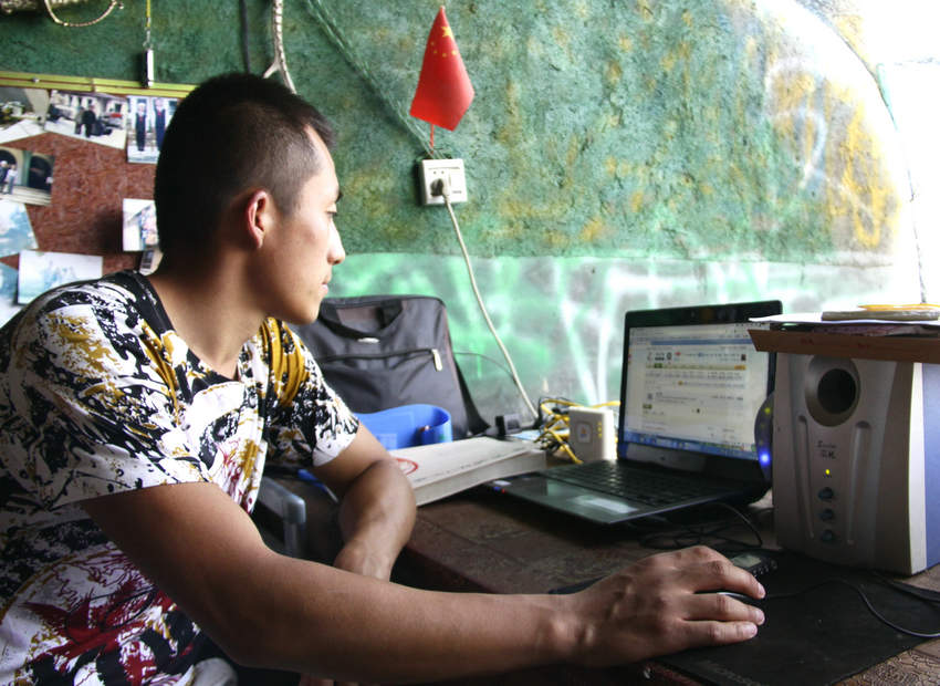 (在自己的工作室上網(wǎng)瀏覽養(yǎng)兔方面的信息是李剛每天必不可少的功課之一 )