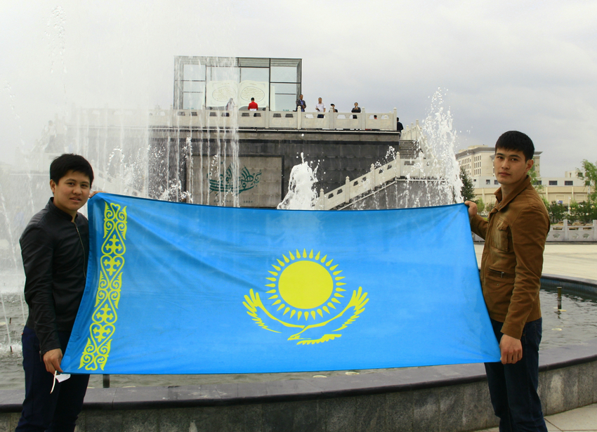 兩位來自哈薩克斯坦國的留學(xué)生在張家川縣回鄉(xiāng)風(fēng)情園內(nèi)展開國旗留念