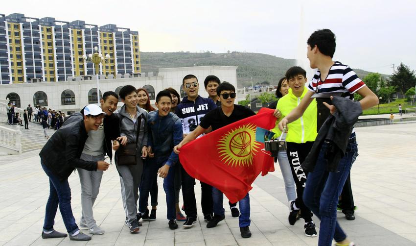 幾位來自吉爾吉斯斯坦國的留學(xué)生手持國旗在張家川縣回鄉(xiāng)風(fēng)情園內(nèi)合影留念