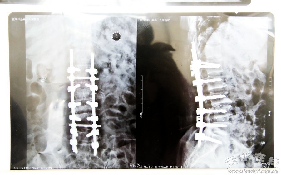 7月18日,馬秀英在張家川縣第一人民醫(yī)院骨科就醫(yī),骨科主任醫(yī)師劉鵬中在對(duì)患者全面診斷后初步認(rèn)為,患者所患疾病為:腰椎滑脫、腰椎間盤(pán)突出伴椎管狹窄、腰椎骨質(zhì)增生、冠心病并心功能不全、類(lèi)風(fēng)濕性關(guān)節(jié)炎、高血壓病。鑒于病情復(fù)雜,劉鵬中代表張家川縣第一人民醫(yī)院與甘肅省中醫(yī)學(xué)院附屬醫(yī)院骨科積極聯(lián)系,雙方多次視頻會(huì)診,省中醫(yī)學(xué)院附屬醫(yī)院骨科主任溫劍濤來(lái)張家川縣第一人民醫(yī)院骨科對(duì)手術(shù)儀器、手術(shù)環(huán)境、麻醉技術(shù)等進(jìn)行實(shí)地考察后,決定在張家川對(duì)患者馬秀英實(shí)施脊椎手術(shù)。7月25日下午,歷經(jīng)7小時(shí)的奮戰(zhàn),手術(shù)圓滿完成。