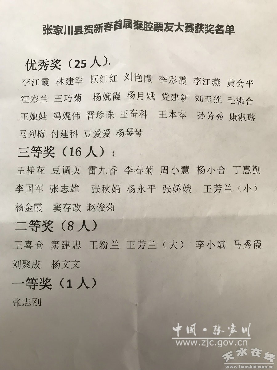 1月31日,張家川縣賀新春首屆秦腔票友大賽頒獎(jiǎng)晚會(huì)在縣影視劇院舉辦?h委常委、宣傳部長(zhǎng)薛林榮代表縣四大組織借此機(jī)會(huì)祝全縣人民新春愉快,闔家幸福,萬(wàn)事如意?h人大常委會(huì)副主任王金祥、縣政府副縣長(zhǎng)汪萍、縣政協(xié)副主席汪雙家和縣文廣局相關(guān)負(fù)責(zé)人為獲獎(jiǎng)選手頒發(fā)了榮譽(yù)證書(shū)。