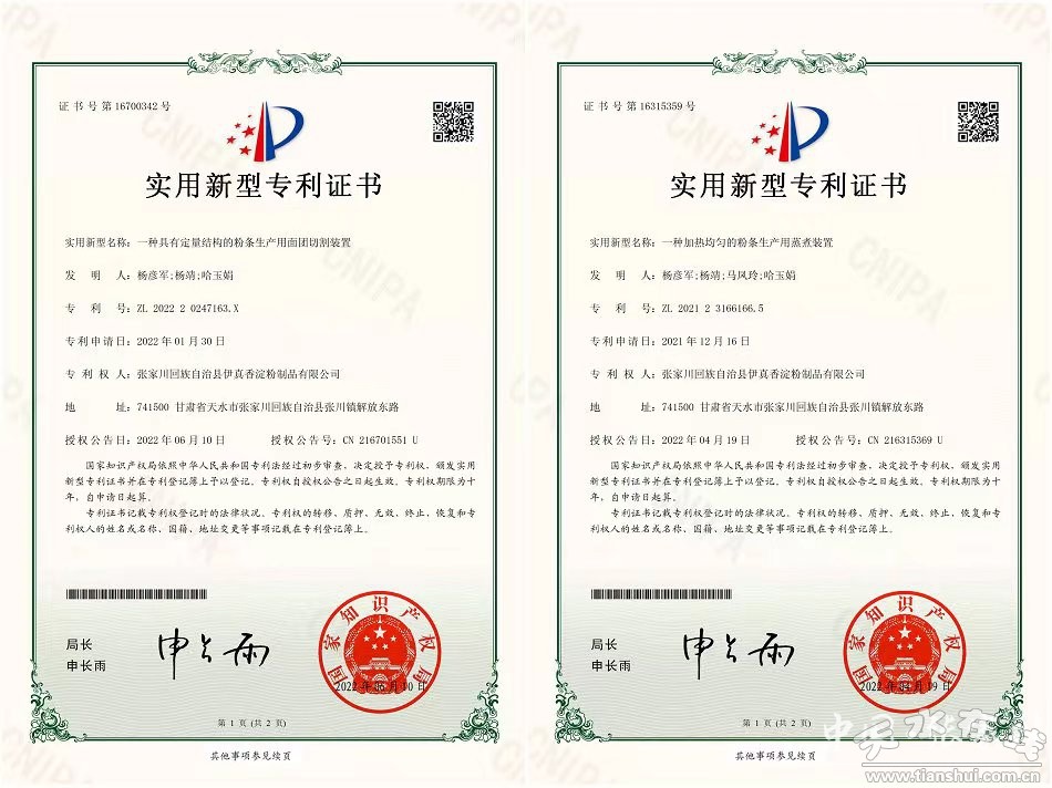 發(fā)展電子商務(wù),必須以科技做支撐,以現(xiàn)代化的技術(shù)手段生產(chǎn)出品質(zhì)優(yōu)良的產(chǎn)品,贏得市場(chǎng)和消費(fèi)者的信賴。據(jù)楊靖介紹,為了尋求新的發(fā)展方式,在深耕自身所熟悉的領(lǐng)域的同時(shí),他轉(zhuǎn)變思想觀念、積極探索新技術(shù)、研發(fā)新的生產(chǎn)設(shè)備、希望帶動(dòng)和幫扶到更多的人員就業(yè)、發(fā)展。為此,他立足張家川實(shí)際和資源稟賦,探索實(shí)施以電子商務(wù)促進(jìn)扶貧開發(fā)的新模式,并投入了大量資金和精力。通過研發(fā)、實(shí)驗(yàn)等過程,2022年獲得粉條生產(chǎn)用定距切面裝置,加熱均勻的粉條生產(chǎn)用蒸煮裝置等三項(xiàng)國家實(shí)用新型專利。