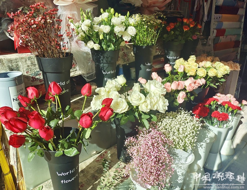 走進相約花藝店,店主鳥紅梅正在打包一個99朵玫瑰的訂婚花束。她說,現(xiàn)在生活條件好了,年輕人訂婚、結(jié)婚都用鮮花了。十年前結(jié)婚的手捧花都是假花,因為張家川買不到鮮花,F(xiàn)在店里有各種各樣的花,賣得最好的就是玫瑰花了,寓意好,打包出來也洋氣。