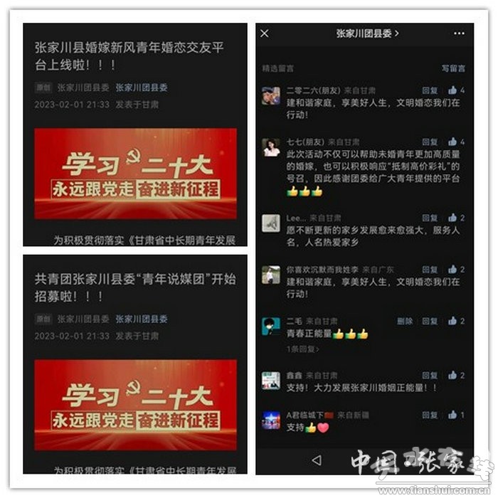 搭建一個(gè)平臺(tái)。2月1日,團(tuán)縣委隆重推出“張家川縣婚嫁新風(fēng)青年婚戀交友平臺(tái)”,設(shè)立“團(tuán)團(tuán)小紅娘”線上婚介微信公眾號(hào)。自平臺(tái)上線以來(lái),累計(jì)收到求偶簡(jiǎn)歷150余份,介紹人次累計(jì)300余次,目前熱戀青年16對(duì),受到了廣大青年和社會(huì)各界人士的一致好評(píng),破解了適婚青年因圈子小無(wú)法覓得如意對(duì)象的困境,有效打擊了職業(yè)婚介人員、民間媒人索要高額介紹費(fèi)用等對(duì)高價(jià)彩禮推波助瀾的不良風(fēng)氣。