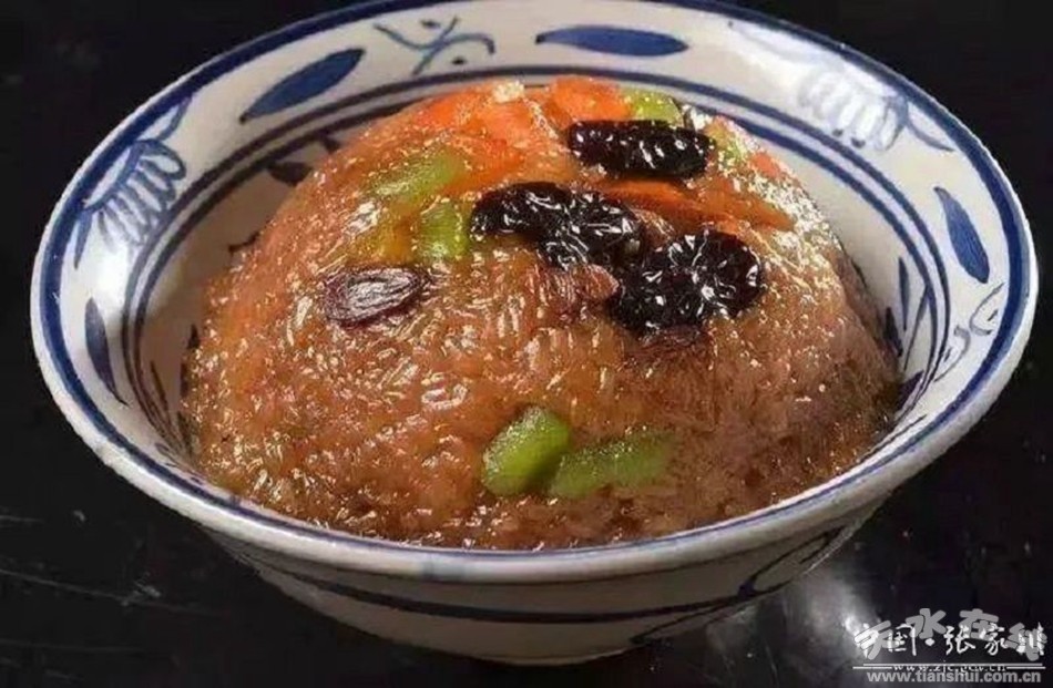 “八寶米”以大米、葡萄干、蓮子、大棗、花生米、枸杞、百合碎片等八種為食材,甜米需要選優(yōu)質(zhì)糯米,淘凈米后浸泡待用,文火鍋中加油,倒人適量蜂蜜和紅糖翻炒至粘稠、顏色鮮艷稍微偏黑倒入泡好的糯米一起翻炒,加入比米多二倍的水,繼續(xù)翻炒至水分變少至米粒粘稠,難以攪動時(shí),在碗中加入葡萄干、蓮子、大棗、花生米、枸杞、百合碎片把鍋中的米盛到碗中,然后放在蒸籠上蒸半小時(shí),取出將碗反扣在盤中,蜜糖四溢,再撒少許白糖食用。
