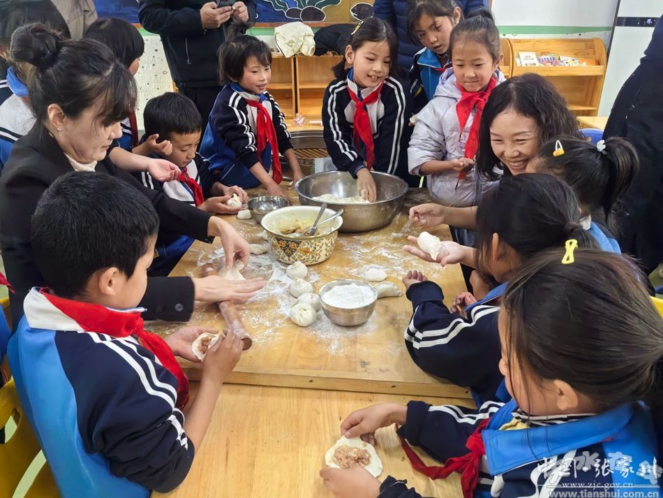 最熱鬧的當(dāng)屬包包子環(huán)節(jié)。老師們備好新鮮餡料與面皮,一邊示范揉面、搟皮、捏褶的技巧,一邊講述狗不理包子的歷史淵源與天津飲食文化。孩子們圍在桌旁,有的認(rèn)真模仿?lián){皮,有的小心翼翼放餡。在老師的耐心指導(dǎo)下,一個(gè)個(gè)圓鼓鼓、形態(tài)各異的包子陸續(xù)擺上托盤。面團(tuán)的清香與師生的歡聲笑語交織在一起,彌漫在校園的每個(gè)角落。