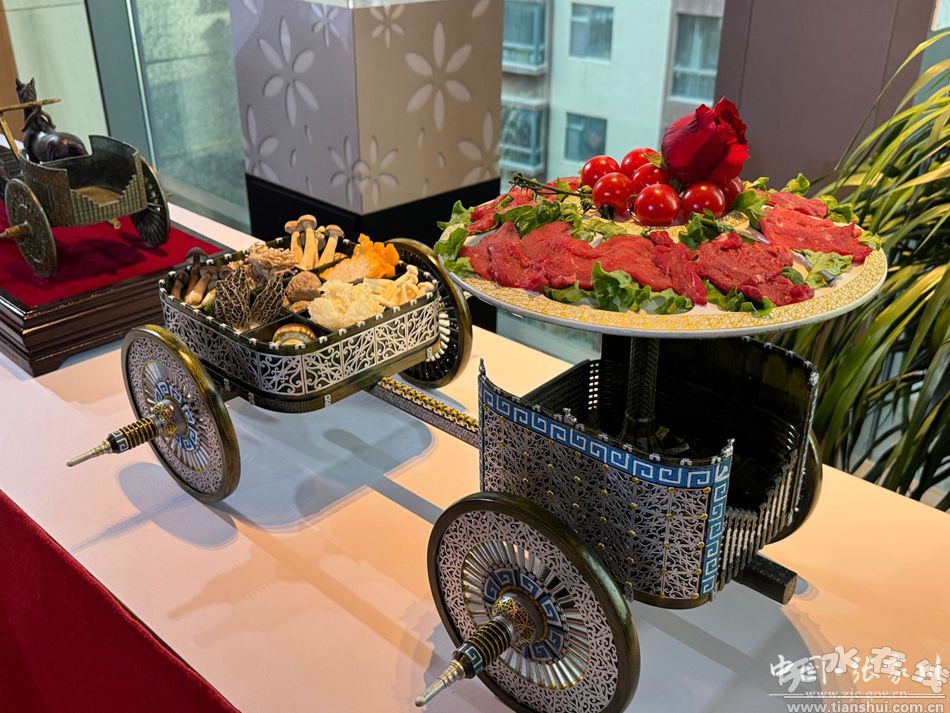 最“吸睛”的還屬戰(zhàn)國(guó)馬車(chē)紅花牛展示餐具。馬家塬戰(zhàn)國(guó)馬車(chē)載著千年西陲的商貿(mào)記憶,而今變作精巧展臺(tái),只見(jiàn)鮮切紅花牛肉如錦繡鋪陳,古今滋味便在此交匯——馬家塬的車(chē)輪曾馳騁絲路,如今紅花牛正沿新絲路香飄遠(yuǎn)方。人聲鼎沸中,品的是千年風(fēng)味,見(jiàn)證的是產(chǎn)業(yè)現(xiàn)代化的生動(dòng)車(chē)乘。