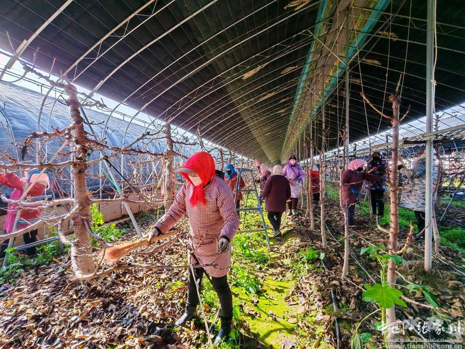 初冬時(shí)節(jié),走進(jìn)張家川縣龍山鎮(zhèn)馬河村的裕豐果品專業(yè)合作社,棚內(nèi)一片熱火朝天的忙碌景象——30余名身著厚衣、頭戴各色圍巾的村民分散在棚間,有的彎腰清掃落葉,有的伸手修剪枯枝,腳下腐葉與新綠交織,傳遞著“冬閑農(nóng)不閑”的忙碌氣息。