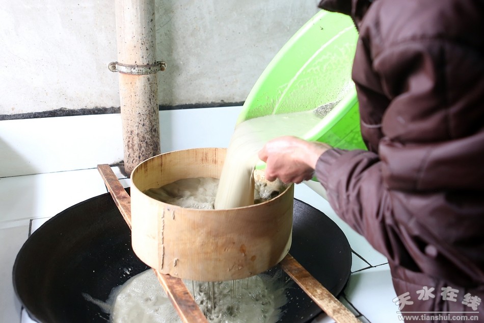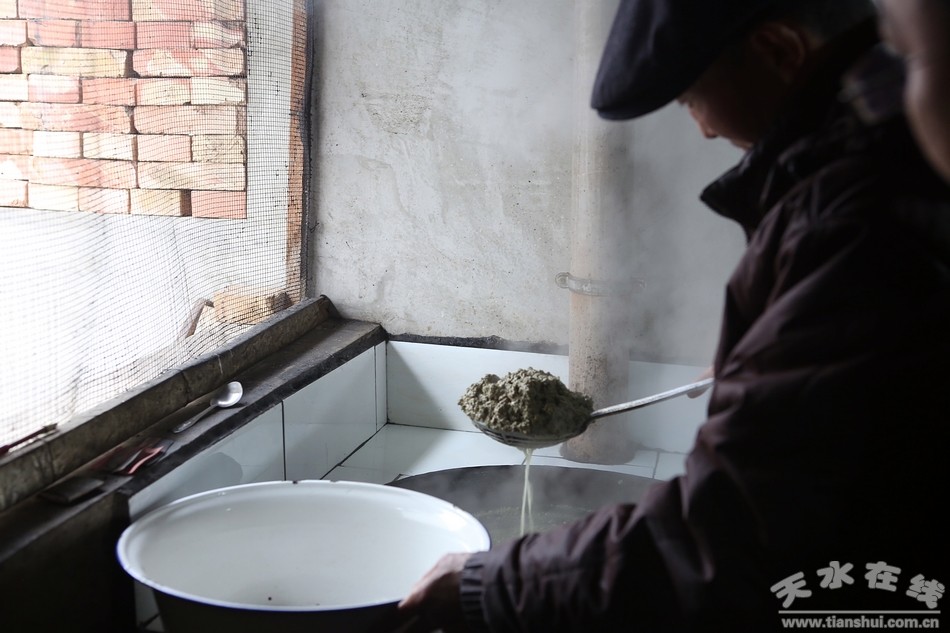 麻仁淘好后,就該煮麻腐了。高旺生在鍋上支起一個(gè)木架,將淘洗出來(lái)的一盆麻仁水倒入濾網(wǎng)進(jìn)行二次過(guò)濾!霸矍匕踩俗鰱|西,就講究個(gè)精細(xì),做麻腐一定要把麻子皮清洗干凈了,不然做出來(lái)的食物吃到嘴里扎舌頭,口感不細(xì)膩!备咄⌒囊硪淼耐鶠V網(wǎng)里面倒水,灰綠色的汁水通過(guò)濾網(wǎng),過(guò)濾至灶臺(tái)上的大鍋內(nèi)。濾網(wǎng)內(nèi)剩下的殘留物,是細(xì)小的麻子皮,過(guò)濾后的麻仁水,就可以燒鍋了。給灶里添上火,等到鍋里的湯汁慢慢沸騰,高旺生拿起勺子開(kāi)始緩緩的在缸里翻攪,幾圈下來(lái),湯汁里面的麻腐慢慢凝結(jié)在一起,滿(mǎn)屋都是一股麻子特有的醇香。“煮麻仁的制作工藝與點(diǎn)豆腐有些相像,成品又和豆腐質(zhì)地相似,所以我們就管這東西叫麻腐!贝蟾攀宸昼姾,高旺生將麻腐撈出,過(guò)濾出殘留的汁水,這麻腐就算是做好了。