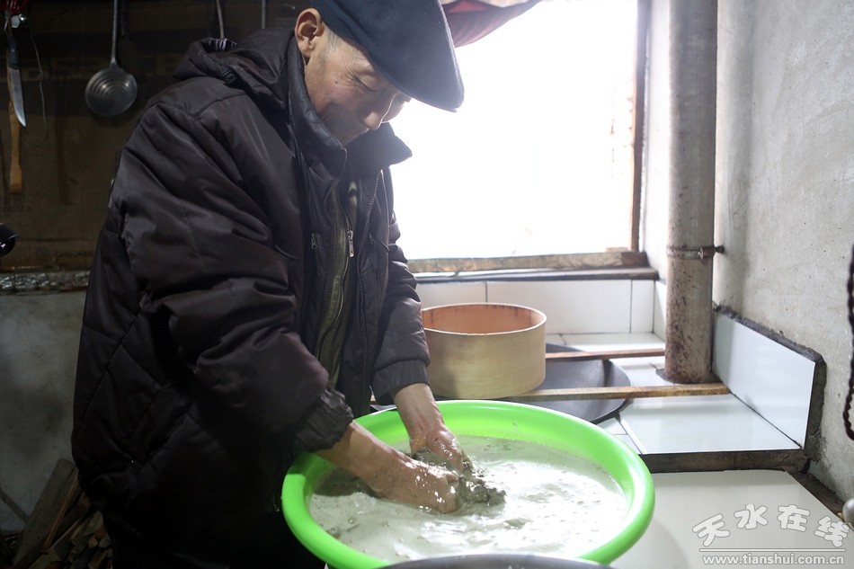 麻子磨碎后,高旺生熱情地吆喝我們跟他去房頂上煮麻腐。他邊上樓邊告訴小編,他們家磨的大多都是內(nèi)蒙古的麻子,顆粒飽滿(mǎn),個(gè)大瓤鮮,做出來(lái)的麻腐吃起來(lái)更有滋味!奥樽硬幌裥←溈梢栽趧兤C(jī)里去皮,它只能先在石磨上連皮帶仁的碾碎,再到水里手工挑揀麻子皮,每天光分篩雜質(zhì)就要花一兩個(gè)小時(shí)。”高旺生在作坊的桌臺(tái)上支起三個(gè)大盆子,里面盛滿(mǎn)熱水,倒入碾好的麻子開(kāi)始一遍一遍地淘仁。他的手慢慢的在盆子里攪動(dòng),一邊搓洗麻仁,一邊將漂浮在水面上的麻子皮挑揀出來(lái),反復(fù)三四次,終于將麻仁淘洗干凈。