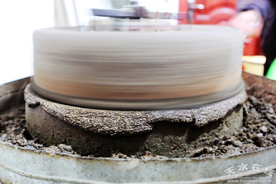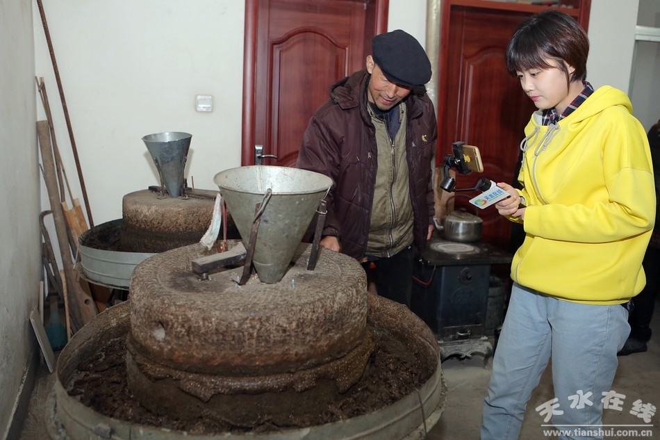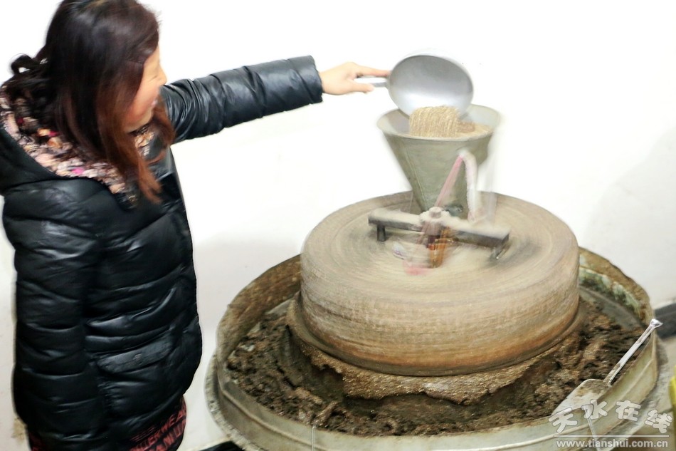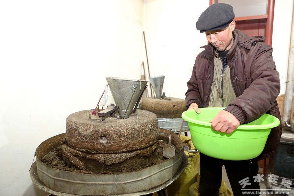 一走進(jìn)高旺生家,就看到他和妻子王慧明正在張羅著磨麻子,“來(lái)得可真巧,我們正準(zhǔn)備給秦都明悅酒店做麻腐呢!”高旺生嫻熟地舀起一勺麻子,倒入石磨上的漏斗里,“因?yàn)楝F(xiàn)在餐飲市場(chǎng)對(duì)麻腐的需求量增大,做麻腐的人又少,我們磨麻子都改用電石磨了,比以前的石磨能省時(shí)省力一些!备咄f(shuō)著,給石磨通上了電,只見(jiàn)麻子一顆顆滾進(jìn)帶凹槽的石磨間,隨著一陣噼里啪啦的響聲,麻子粒被碾碎成了泥狀,一股麻子仁的香味漾滿(mǎn)小屋。