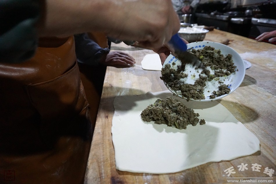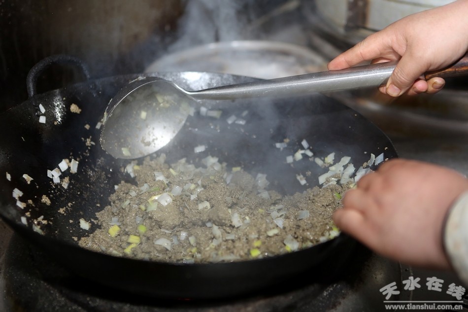 熱騰騰的麻腐餅剛一上桌,馬正榮就提醒小編最好趁熱吃,因?yàn)閵A了炒過(guò)的餡料,放涼后烙餅容易變軟,口感會(huì)有所影響。烙好的麻腐餅看起來(lái)酥脆可口,咬一口下去,卻出乎意料的饃瓤綿軟,滿(mǎn)口溢香。麻子獨(dú)特的清香和餅子的麥香交融在一起,不需要佐以蘸料,就能讓人食之不膩,回味無(wú)窮,那是除了天水外在任何地方都吃不到的美味。尤其在初春乍暖還寒之時(shí),能吃上一口香氣誘人的麻腐餅,讓人不禁感嘆,從制作麻腐到烙餅出鍋,這三個(gè)多小時(shí)真是沒(méi)白等!