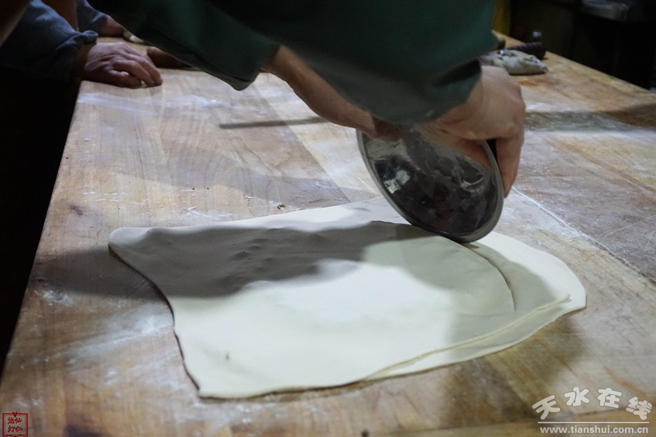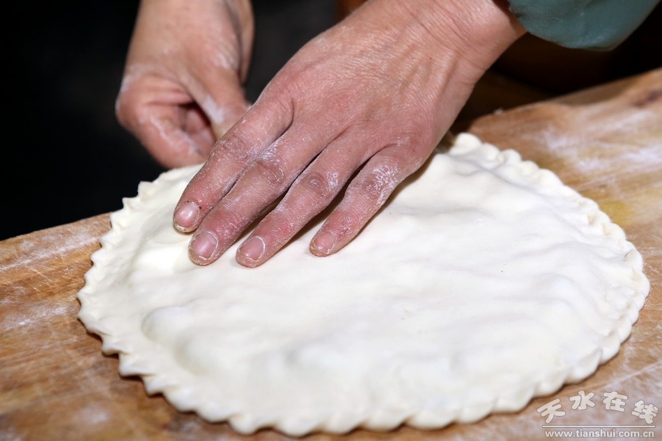 這邊熱氣騰騰的麻腐剛出鍋,那邊已經(jīng)和好面準(zhǔn)備放餡料了。只見(jiàn)幾個(gè)女廚師飛快的把面團(tuán)搟成兩張薄面片,一張放在案板上,將炒好的餡料呈圓形均勻地抹在上面,另一張蓋在餡料上,壓邊捏花。緊接著就是烙餅了,將麻腐餅扎上小孔放入預(yù)熱好的電餅鐺里,用200度以上的火烙五分鐘左右,等底面烙熟泛黃后,將其翻面,待麻腐餅兩面微黃而不焦即可出鍋。