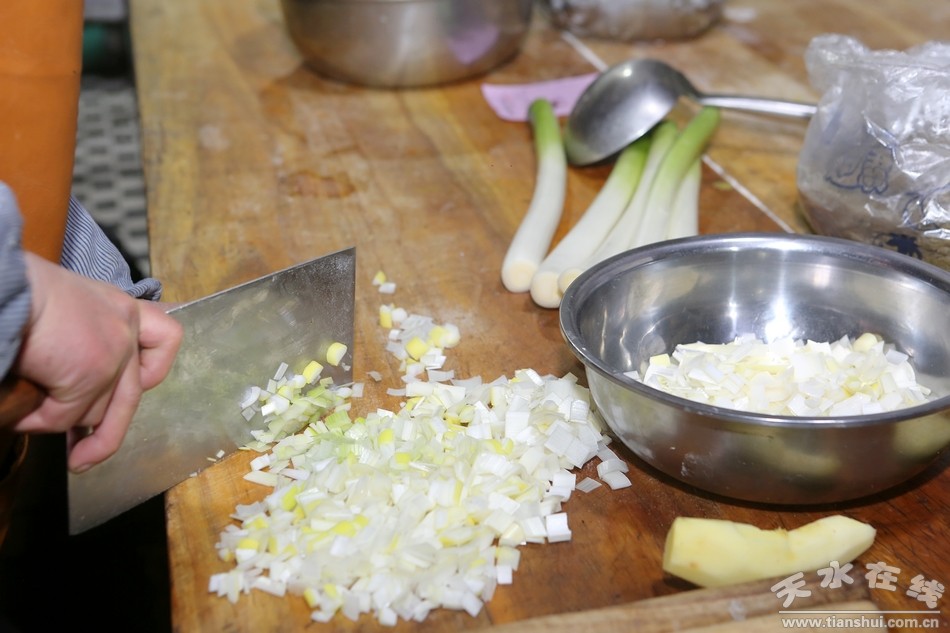 “今天下著小雨,正適合吃點(diǎn)熱乎的麻腐餅暖暖身子。”小編跟著馬正榮來(lái)到秦都明悅酒店的后廚,只見(jiàn)里面一片熱火朝天的景象!奥楦呀(jīng)有了,現(xiàn)在就需要炒餡料和烙餅了。”馬正榮一邊給鍋內(nèi)倒油,一邊告訴小編,他來(lái)秦都明悅酒店已經(jīng)五年了,幾乎每一桌外地客人來(lái)店里都會(huì)點(diǎn)這道菜。油燒熱后,馬正榮將冒著熱氣的麻腐倒入鍋中,略微翻炒后加入蔥花和五香粉提味,待麻腐入味后,將其盛出鍋留作餡料。就在麻腐出鍋的一瞬間,麻仁的鮮香味兒竄滿(mǎn)廚房,光聞一下味就能讓在場(chǎng)的人舌根生津。