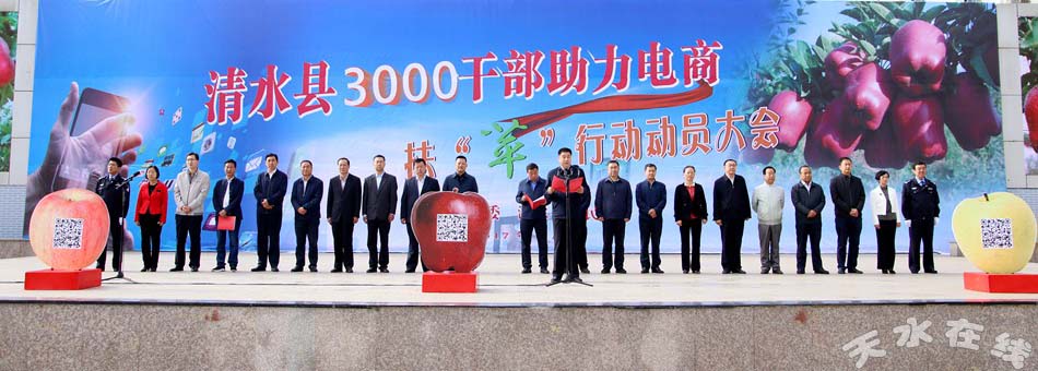 (天水市委常委、宣傳部長(zhǎng)蒲軍,天水師范學(xué)院校長(zhǎng)蔡文浩,天水師范學(xué)院副校長(zhǎng)王旭林,市人大常委會(huì)副主任、清水縣縣委書記劉天波,市委副秘書長(zhǎng)、機(jī)要局局長(zhǎng)于旭峰,市政府副秘書長(zhǎng)焦新德,市商務(wù)局局長(zhǎng)李尚平,清水縣委副書記、縣長(zhǎng)馬越垠,甘肅銀行天水分行行長(zhǎng)陳金輝,天水師范學(xué)院黨委常委、組織部長(zhǎng)馬超,天水師范學(xué)院黨委常委、宣傳部長(zhǎng)汪詠國,清水縣委常委、統(tǒng)戰(zhàn)部長(zhǎng)李振,縣委常委、宣傳部長(zhǎng)盧芳,副縣長(zhǎng)王懷珍, 天水在線負(fù)責(zé)人,清水縣縣直有關(guān)部門、天水師范學(xué)院有關(guān)處室及二級(jí)學(xué)院的領(lǐng)導(dǎo)及學(xué)生近400人,現(xiàn)場(chǎng)掃描二維碼,啟動(dòng)”天水師范學(xué)院助力清水電商扶‘蘋’行動(dòng),在微信朋友圈宣傳本次活動(dòng),推介清水果農(nóng)微信直銷花牛蘋果二維碼。)