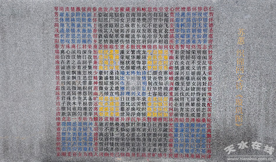 年僅21歲的蘇蕙,獨(dú)守秦州空房!昂鲆娔邦^楊柳色,悔教夫婿覓封侯”,對丈夫的思念與日俱增。天資聰慧,幼時多才,三歲學(xué)字,五歲學(xué)詩,七歲學(xué)畫,九歲學(xué)繡,十二歲學(xué)織錦的蘇家三小姐,才思與情思一般婉轉(zhuǎn),把愁與恨、思與悲、情與愛,化作文字,寄入詩中,一針針、一線線,織入美麗的錦緞,成就千古奇跡璇璣圖。天水西關(guān)二郎巷,相傳就是蘇蕙織璇璣圖的地方。巷口原有牌樓,懸兩匾,內(nèi)匾書“古織錦臺”,外匾文“晉竇滔里”,兩邊有聯(lián)“鶯花古巷秦州陌,云是蘇娘舊時宅”,清代詩人楊蓉裳憑吊織錦臺留詩,其中句子。