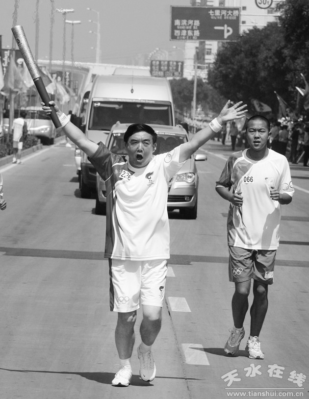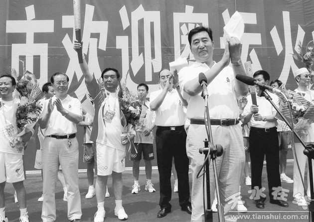 根據(jù)2008年北京夏季奧林匹克運動會組委會安排,經(jīng)甘肅省火炬?zhèn)鬟f組委會確定,參加甘肅省火炬?zhèn)鬟f的火炬手共624名,護跑手161名。天水市確定17名火炬手參加在甘肅省境內(nèi)相關(guān)城市的火炬?zhèn)鬟f活動。我十分榮幸的以天水市政協(xié)主席身份,被選為在甘肅省境內(nèi)進(jìn)行奧運火炬?zhèn)鬟f的一名火炬手。那一刻,是我一生中最幸福的一刻,也是我一生中最難以忘記的那一刻。