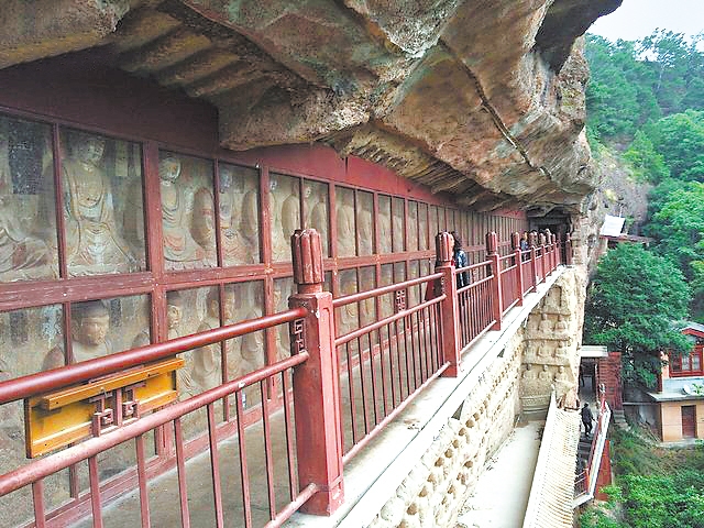 大凡名山,多有名寺,麥積山也不例外。這個(gè)建于北魏、歷經(jīng)千年風(fēng)雨、用泥和棉花、頭發(fā)、蛋清雕塑的石窟是一個(gè)寺院,高掛在半天半地的山腰間。如此規(guī)模宏大的崖閣,摩窟,摩崖龕、山樓、走廊,都是凌空鑿建于幾十米高的懸崖峭壁上,令人贊嘆不已。